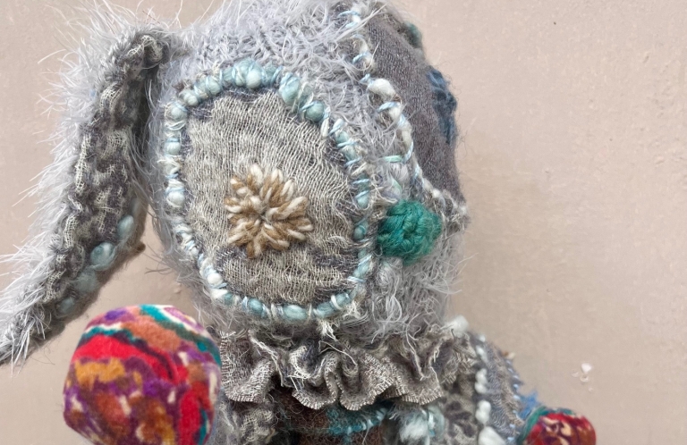 ワイヤーを芯に古着,布で肉付け、立体裁断、手縫い